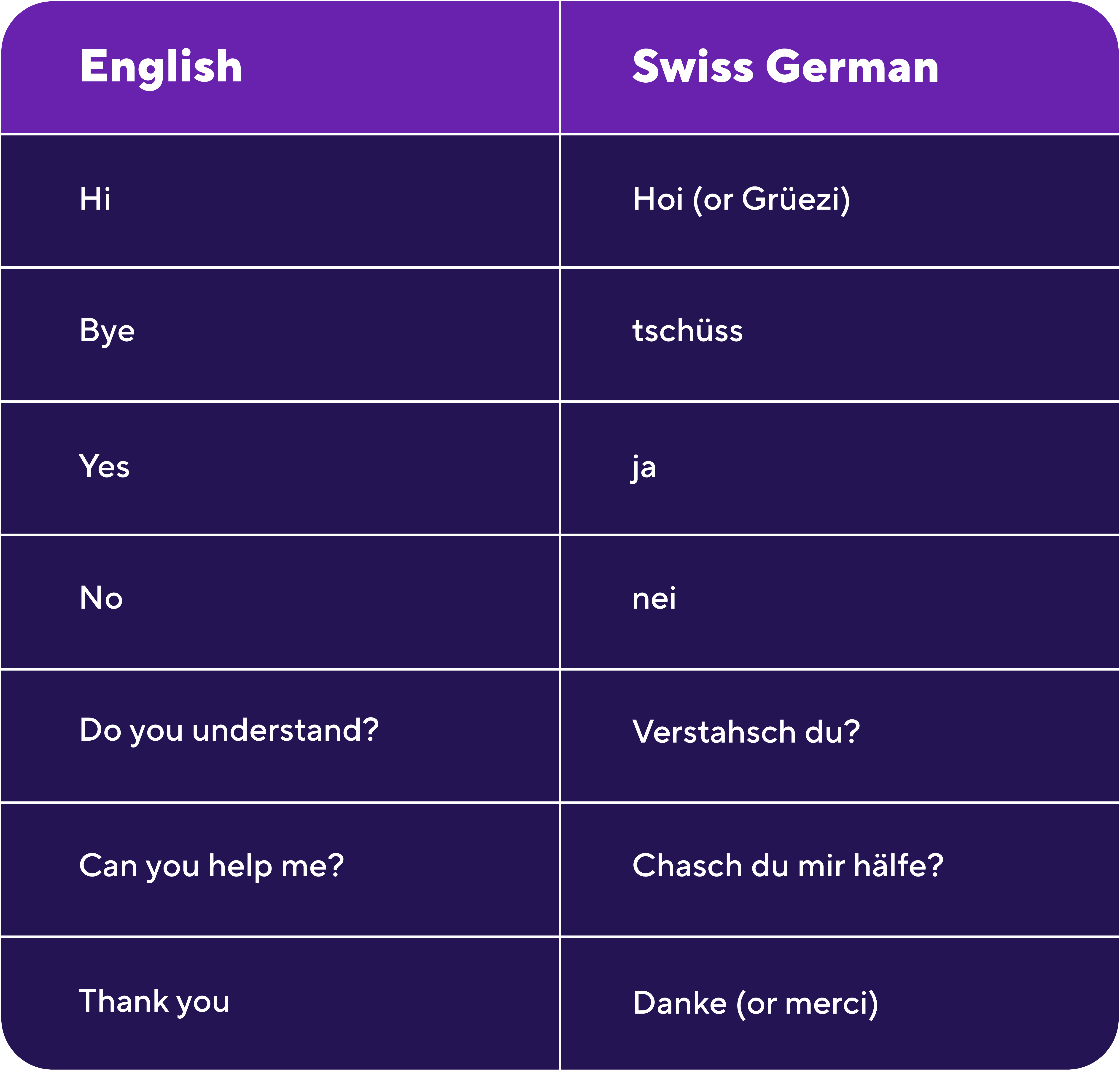 While Standard German will help you manage in Switzerland as it’s commonly used in formal situations, Swiss German will truly help you thrive in everyday social settings. Some Swiss German words and structures are also remarkably different from their Standard German equivalent. By learning Swiss German, you show that you care, distinguishing yourself from other expats or tourists.